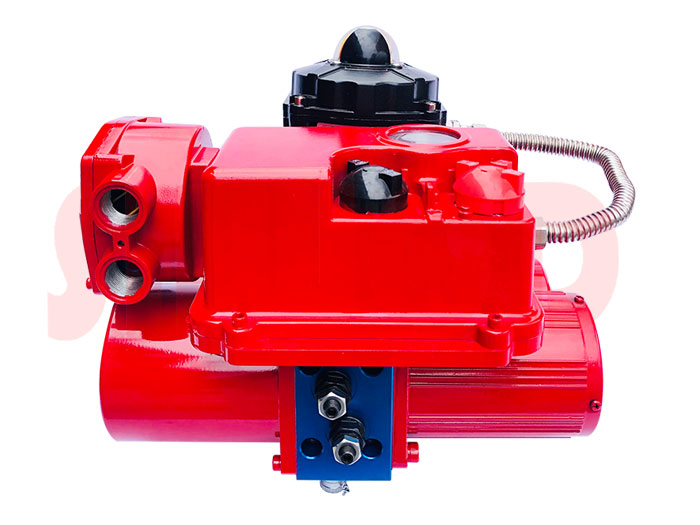 电液执行器由支架,双作用齿轮齿条执行器、液压动力源和电气控制系统组成。 其中液压动力源包含电机泵组以及手动泵。